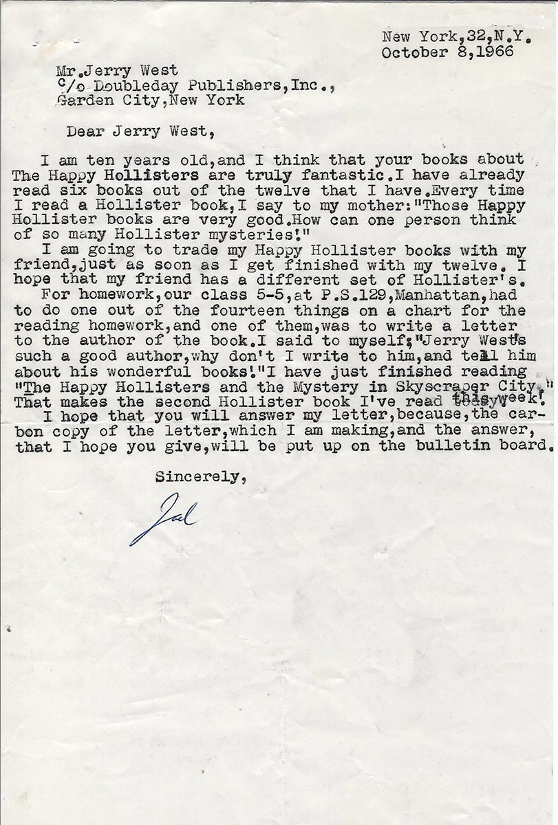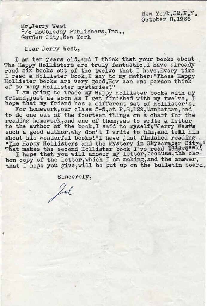 Andy Svenson III, grandson of the author, got another little atomic jolt when Joel called the Happy Hollisters Hotline just a few days later. Joel was excited to see his letter again, and he had very fond memories of reading the series as a child. His mother kept him well-supplied with books to read, enrolling him in the original Happy Hollisters Book Club. He was one of about 30 children chosen for a special gifted/enrichment program for grades 4-6, where he met his reading teacher, Mrs. Wiley. It was she who encouraged her students to write to a famous author, and responses the students received, like Joel’s letter from Jerry West, were shared on the classroom bulletin board. Joel kept in touch with Mrs. Wiley for many years, and he is in contact with a couple of his former classmates at PS129 to this day.