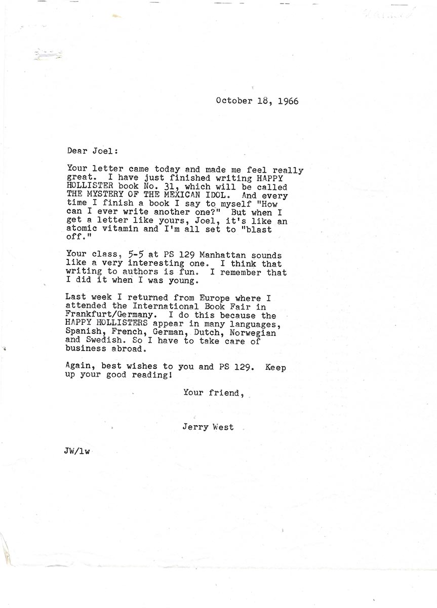 Luckily, one day in October 1966, Jerry West (one of Svenson’s many pen names) got a swell letter from a fan in New York City who wrote, “Jerry West’s such a good author, why don’t I write to him, and tell him about his wonderful books!”