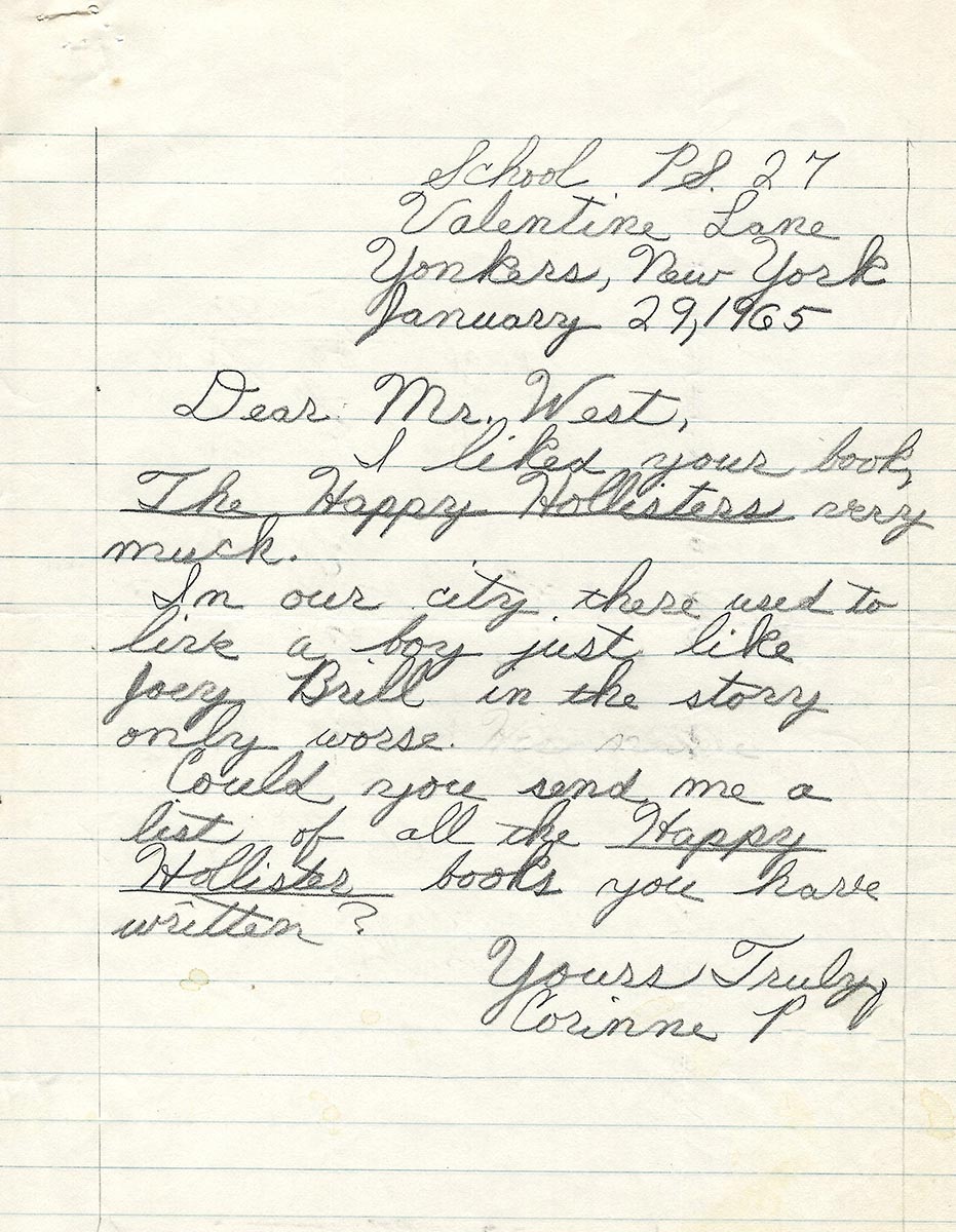 Corinne P. of Yonkers, NY, wrote to Happy Hollisters author Jerry West in 1965 and told him of just such a boy.